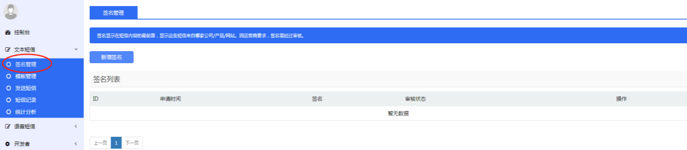2. 在管理后台左侧界面选择文本短信——签名管理,进入签名设置界面