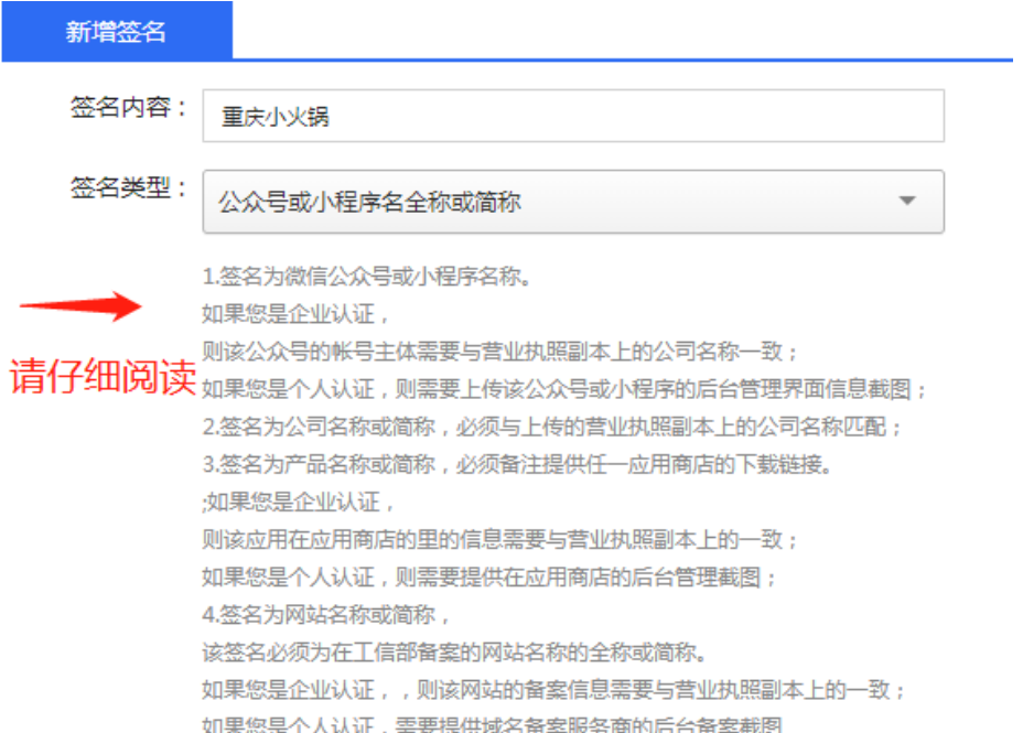 3. 点击“新增签名”跳转页面,填写签名内容和签名类型根据提示按照不同签名类型填写备注,需要的截图与文件在选择文件处上传