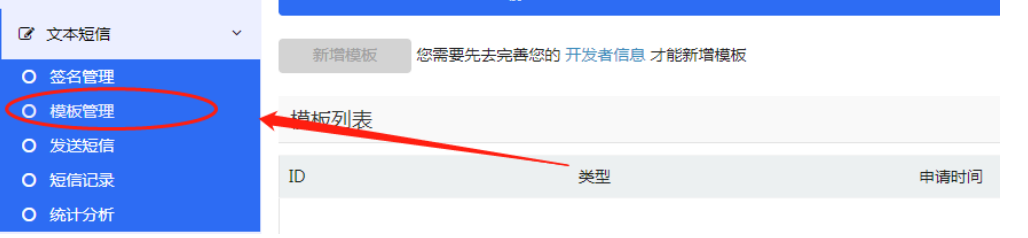 1. 在管理后台左侧界面选择文本短信——模板管理,进入模板设置界面