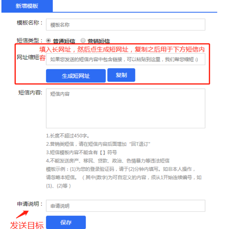 3.根据所需内容填写模板内容,在申请说明一栏填写发送目标