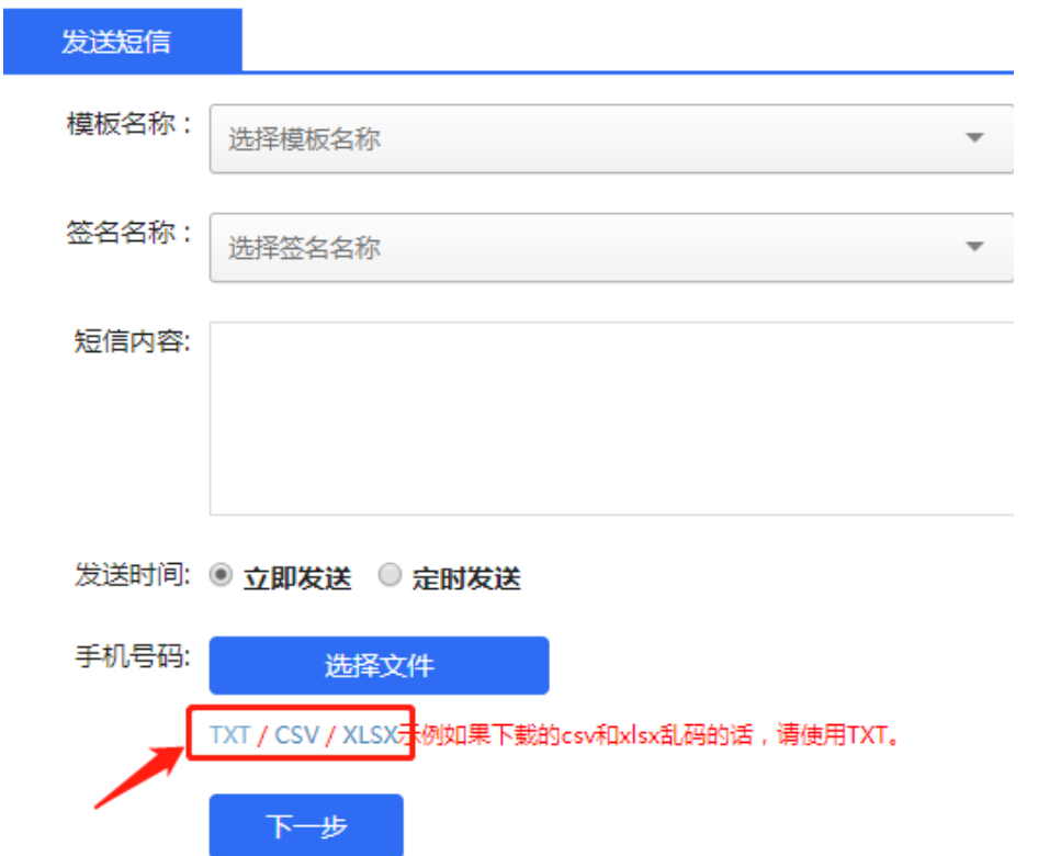 2. 点击发送短信,跳转页面选择模板、签名和内容以及发送时间填写好短信内容之后添加手机号码,按照示例里的格式填写号码示例在如图箭头指示位置打开